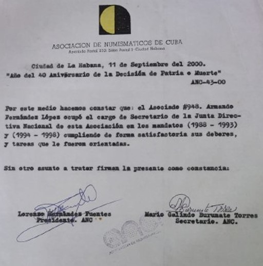Documento que hace   constar que: el Asociado #948. Armando Fernández López ocupó el cargo de Secretario de la Junta Directiva Nacional de esta Asociación en los períodos (1988 – 1993) y (1994 – 1998) cumpliendo de forma satisfactoria sus deberes, con la dedicación que le caracteriza. Firmado por: Lorenzo Fernández Fuentes  Presidente. ANC Mario Uñido Durante Torres Secretario. ANC