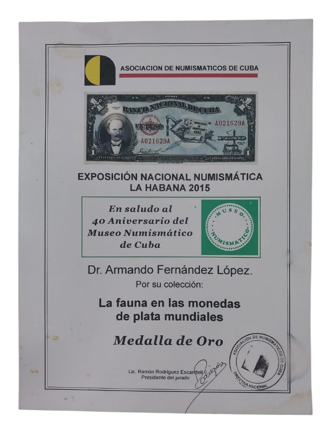 En la imagen del Diploma o que acredita al brillante y sencillo coleccionista numismático señor Ing. Jorge Emilio Gonzáles Valdes  como el Premio Nacional de la Numismatica Cubana año 2025