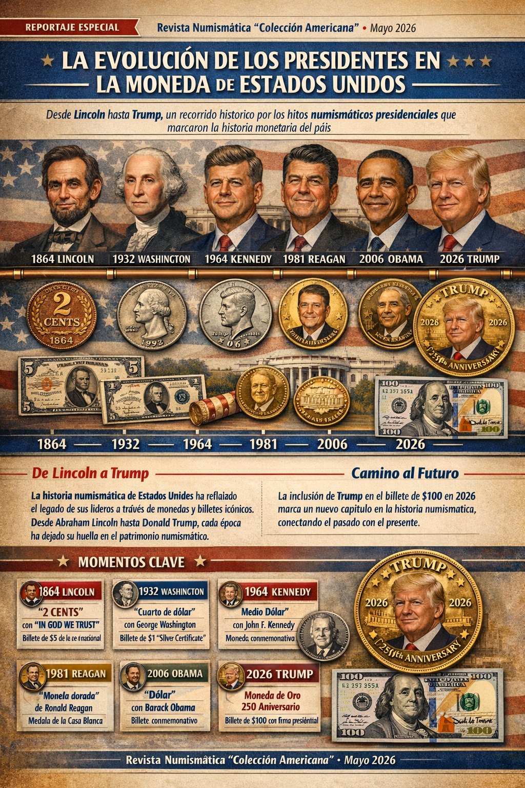 – Trump (2026): Moneda de oro conmemorativa por el 250 aniversario y billete de $100 con su firma.